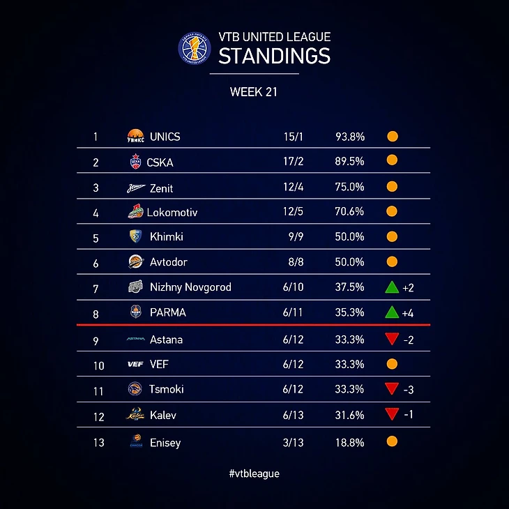 Этот факт общеизвестен, но о нем хочется говорить снова и снова – борьба за две вакантные путевки в плей-офф ведется максимально плотная, а положение команд в таблице с седьмого по двенадцатое места радикально меняется по итогам каждой игровой недели. После двух недавних поражений от конкурентов («Цмоки-Минск» и ВЭФ) «ПАРМА» выпала из восьмерки, но победа над «Астаной» позволила уральцам подняться с двенадцатого места на восьмое. При этом клуб из Казахстана одновременно упал с седьмой строчки на девятую. Российский клуб более чем заслужил подобный турнирный лифт, ведь пермякам удалось прервать 4-матчевую серию домашних побед дружины Михаила Карпенко. Особые усилия в составе «ПАРМЫ» приложил Яник Морейра, который выдал второй результат сезона по подборам – 17.