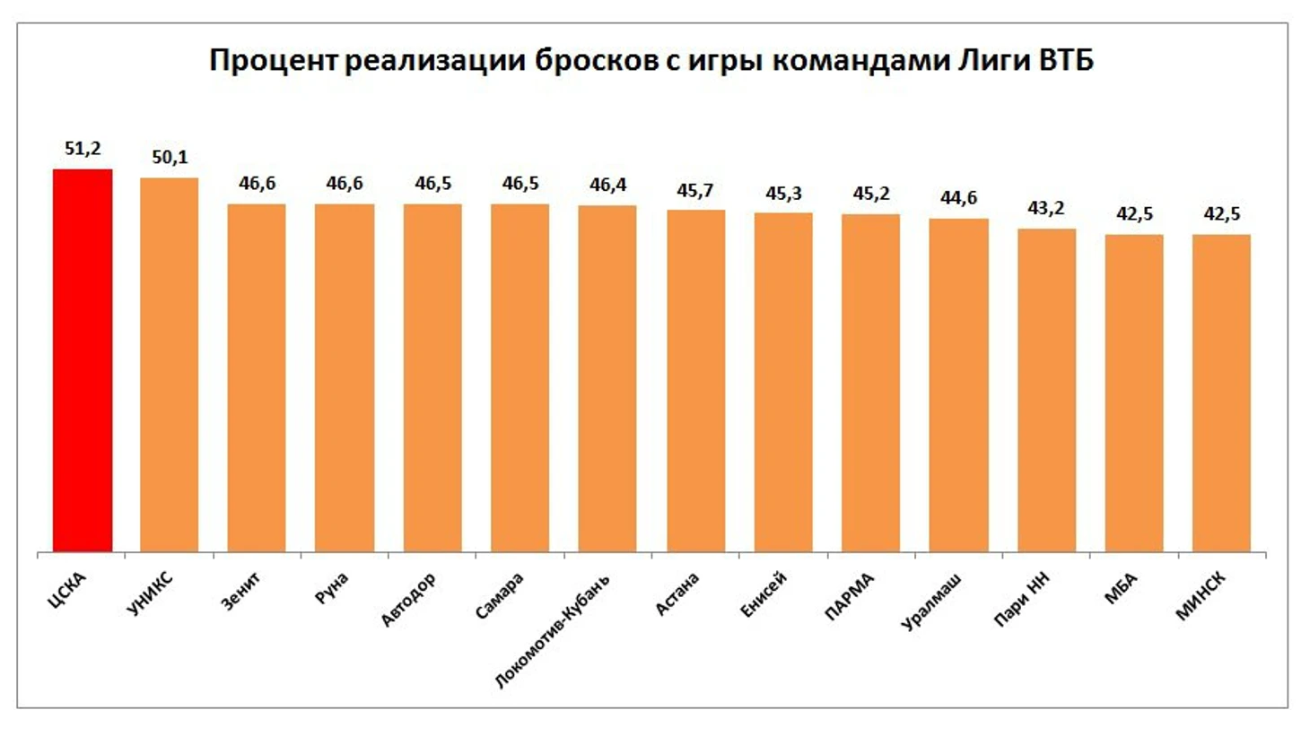 ЦСКА сейчас лидирует в лиге по проценту реализации двухочковых (58,7%), трехочковых (39,1%) и штрафных бросков (81,0%).