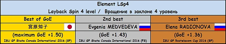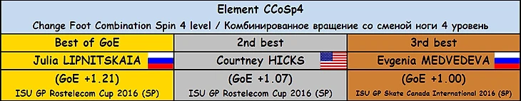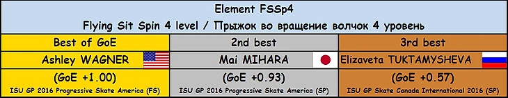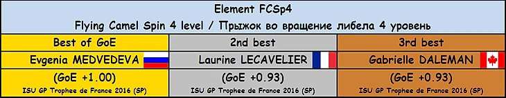4. В номинации участвуют только тройные прыжки и аксель 2,5. Т.к. двойные на соревнованиях исполняют как правило фигуристки низкого уровня подготовки, те которые не обладают пока в наличии тройным прыжком, а те кто владеет тройными то исполняют двойные либо в результате ошибки, либо в каскаде со старшим тройным. Вращения участвуют все 4-го уровня, т.к. как по факту оказалось, что ГОЕ у вращений ниже 4-го уровня были всегда ниже чем ГОЕ у 4-го уровня.