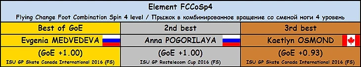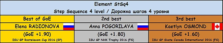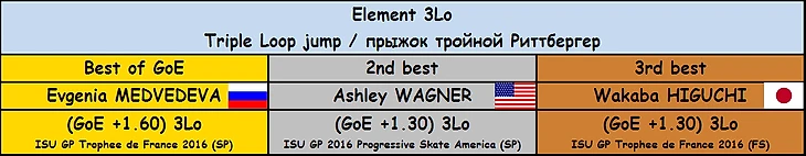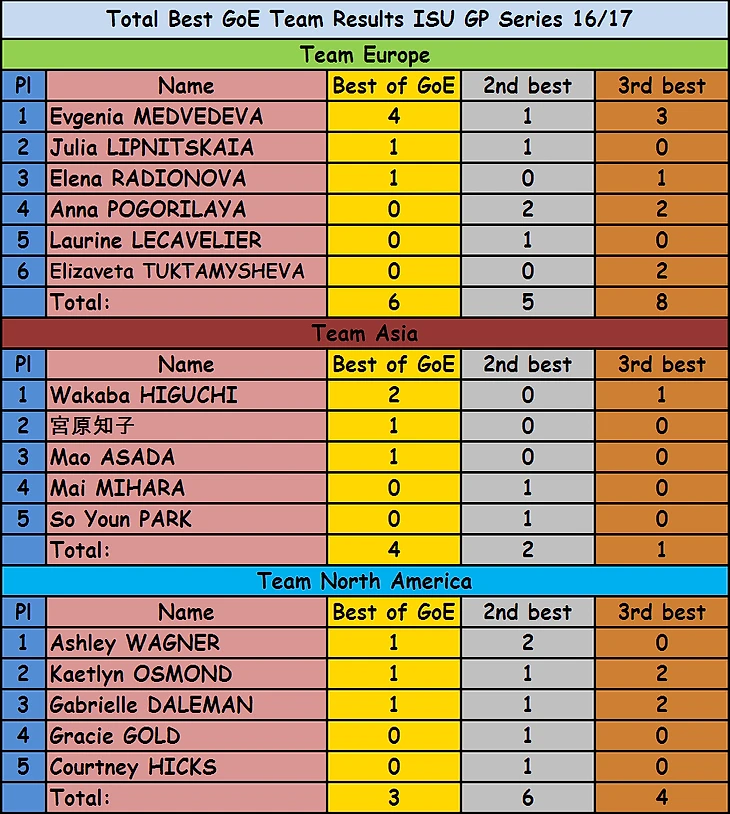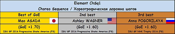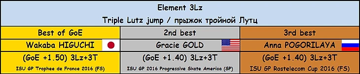 По ходу этапов ГП сезона 16/17 тысячи раз были исполнены ФК элементы на соревнованиях. Однако какие из них были исполнены лучше всего по мнению судей? Попробуем разобраться. Для этого возьмем все протоколы всех 6ти этапов ГП. Выпишем одинаковые элементы из протоколов, и найдем среди них лучшие ГОЕ.