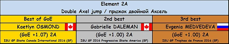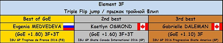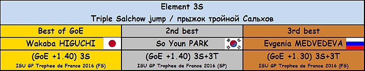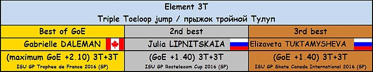 2. При сравнении лучших ГОЕ за прыжки, используются также прыжки исполненные в каскаде. При условии, что оцениваемый прыжок в каскаде самый дорогой, т.е. тот по которому ГОЕтся весь каскад. Например 3Т оценится в каскадах 3Т+3Т или 2А+3Т или 3Т+2Т и аналогичные. В случае например 3F+3Т участия не принимает, т.к. в этом каскаде ГОЕтся по 3F а не по 3Т.