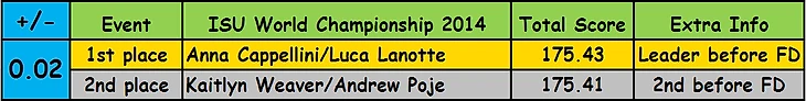 1.Для сравнения используются только турниры: Чемпионат Мира, Европы, Четырех Континентов, Олимпийские Игры (WC, EC, 4CC, OWG). Хотелось добавить ЮЧМ (было пару случаев) и ФГП, но все же это не то немного. ЮЧМ турнир престижный и звание, но все же там не участвуют многие спортсмены, которые по возрасту могут, предпочитая на взрослых и наоборот. ФГП - сильный турнир, однако более все таки коммерческий, и звание Чемпион ФГП не дают официально, и не настолько второе место ФГП обиднее чем на Чемпионатах.