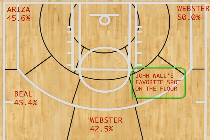 Любимый бросок Уолла с правого края под 45 градусов со средней дистанции. При этом, на это место приходится 16.5 процентов от общего количества бросков Уолла, из которых точными оказываются 40 процентов попыток.