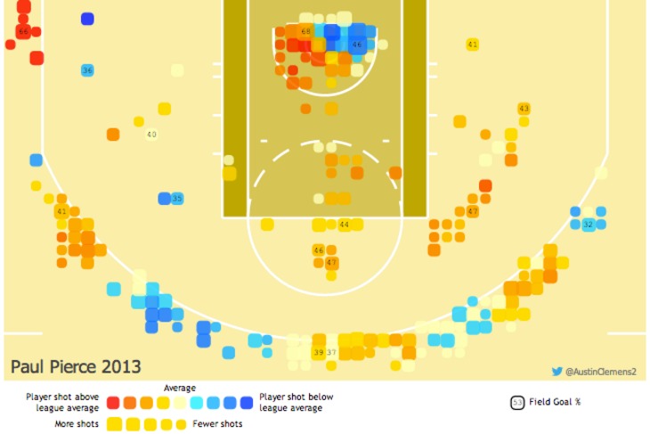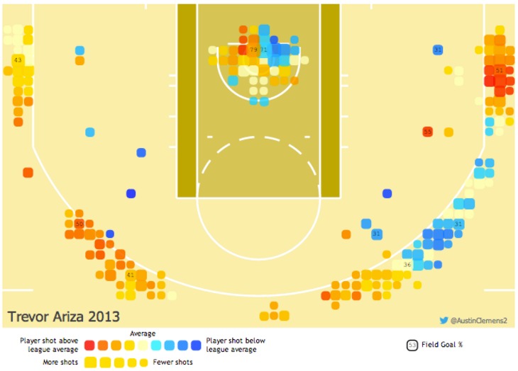 Пирс не столь хорошо в кэтч-н-шуте как Ариза, успешно завершая 39.5% бросков с дальней дистанции. Как вы видите на графиках, так называемые "hot zones" (т.е. точки на площадке, откуда игроки атакуют с более высоким процентом нежели средний по лиге) у них примерно одинаковые, однако здесь есть некоторые нюансы.