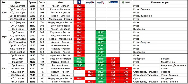 Как видим, в этот раз "Первый канал" не показал впрямую лишь 3 товарищеские игры перед Евро. При этом обладатели каналов "НТВ-Плюс" могли восполнить и этот пробел. В этот раз все игры сборной в том или ином виде получили прямой эфир, что случилось впервые в истории показа игр национальной команды. Также я не указал комментаторов финального турнира Евро на "Спорте", чтобы не перегружать таблицу, всё указано в информации о комментаторах в абзаце сверху. Ну и стоит отметить, что "Первый канал" стал подстраивать сетку вещания под показ игр сборной: ради игры с Израилем программа "Время" вышла на полчаса раньше. Перенос главной новостной программы из-за футбола практиковался на канале и до этого, но только на важных играх, а с этого времени "Первый" всегда ведёт прямой эфир с матчей сборной России, меняя выход "Времени" в случае накладки.