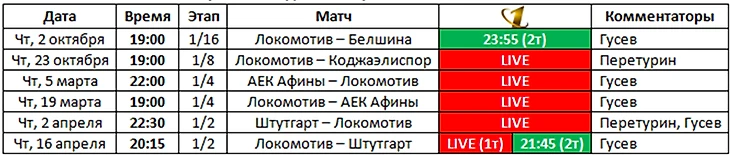 На российском ТВ не были показаны гостевые игры "Локомотива" с "Белшиной" и "Коджаэлиспором". Домашняя встреча с белорусами ограничилась вторым таймом в записи. Весенняя стадия была показана почти впрямую. Стоит оговориться, что трансляция выездной игры со "Штутгартом" в программе прописана не была, поэтому указание прямой трансляции на ОРТ исходит из репортажа, который сохранился в сети. Ответная игра уже была указана в программе, но из-за новостей 2-й тайм был вновь отправлен в запись (да, даже полуфинал еврокубка с нашим участием не был поводом для радикального изменения программы).