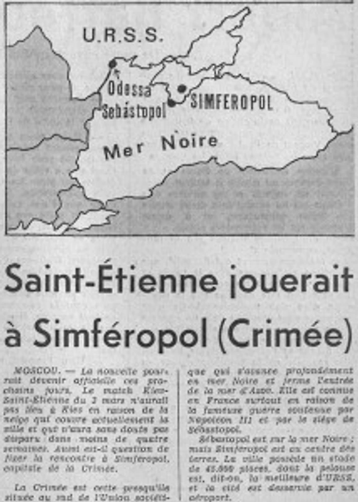 Но уже меньше месяца остается до возобновления игр в кубке чемпионов и руководители Сент-Этьенна не тратят время впустую по оформлению вояжа в СССР для Пьера Гаронэра.10-го февраля, сопровождаемый M. Duraincy, « persona grata » для Советской федерации футбола, стефануаский путешественник встречается с советскими спортивными фунционерами. Они договариваются о месте первой встречи: это будет Симферополь, столица Крыма. На следующий день Гароннэр в сопровождении члена федерации А. Парамонова вылетает на знакомство с городом, стадионом предстоящей встречи и для бронирования гостиницы для стефануаской делегации.