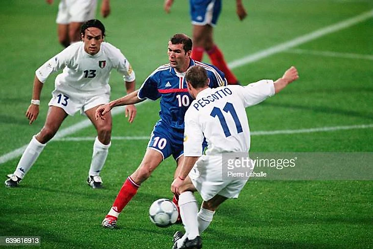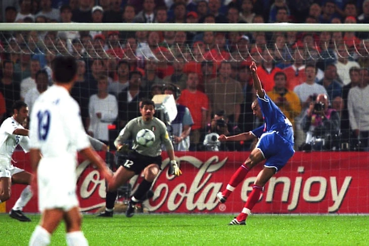 На 103-й минуте Тольдо, овладев мячом после очередной атаки французов, выбивает его в центр поля на левый фланг. Монтелла (очень неудачно вел борьбу, не сумев зацепиться за мяч) и Дешамп пытаются овладеть мячом. Дешамп падает, но его подстраховывает Пирес и овладевает мячом, начав французскую многоходовку, вектор направления которой определял Зидан. Правда, его пас вразрез на Анри несколько не получился-нападающий не сумел остановить мяч, достающийся Каннаваро. Итальянский треугольник из Пессотто, Каннаваро и Альбертини пытается разыгрывать мяч между собой, но пас Каннаваро на Альбертини вышел какой то судорожный и передачу Альбертини на Пессотто перехватывает Пирес. Робер стремительно ускоряется, проходит между двух оппонентов, легко уходит от Каннаваро. На подстраховку бросается Неста, но и ему не хватает скорости. Пирес, почти дойдя до лицевой линии, делает пас назад в центр штрафной под удар свободному Трезеге. В момент прорыва Пиреса Трезеге уже пребывал в самом центре штрафной, где его стерегли Юлиано и Мальдини. Когда Пирес всех прошел, Юлиано кинулся блокировать его возможный прорыв во вратарскую слева, а Мальдини на короткое время теряет Трезеге. Нападающий вначале двигался к воротам вместе с Мальдини, но затем резко остановился и делает пару шагов назад, к 11-метровой, тонко прочувствовав куда именно пойдет мяч от Пиреса, а вот Мальдини остался на месте и Трезеге уже могла помешать только собственная техника исполнения удара по сложно шедшему мячу. Давид ухитрился забить ударом с лету левой ногой при том, что пас шел с левого же края. Пошла 104-я минута. Итальянцев просто додавили, а Зидан после финального свистка заметит «что же до меня,то я сейчас в прекрасном физическом состоянии и не чувствую никакой усталости»...