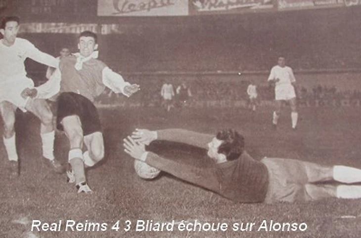Таким образом, первый финал кубка чемпионов стал как бы наградой для газеты Экип за их проницательность: французский чемпион встречался с мадридским Реалом на Парк де Пренсе, в точности повторяя финал Латинского Кубка прошлого года. И Реймс едва ли мог начать его лучше. На 6-й минуте после штрафного в исполнении Копа, мяч от бутсы бросившегося под удар защитника Рафаэля Лесмеса попал к Леблону, головой перебросившего мяч через голкипера Хуанито Алонсо. Последний позже утверждал, что мяч не пересек линии, но подтвердить это невозможно, английский рефери Артур Эллис засчитал гол.