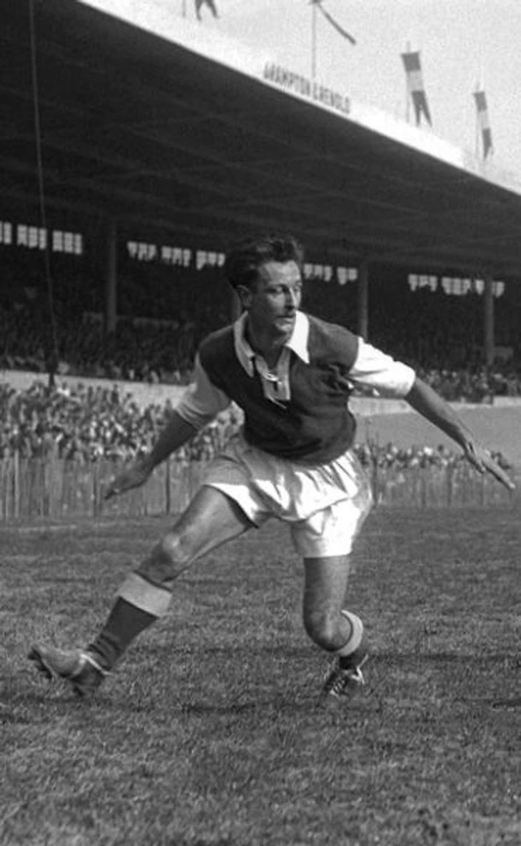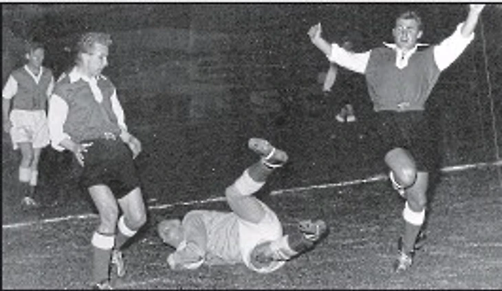 Фрагмент полуфинала кубка чемпионов 1955\56. Голкипер шотландцев Янгер не позволяет отличиться Мишелю Идальго и Гловацки