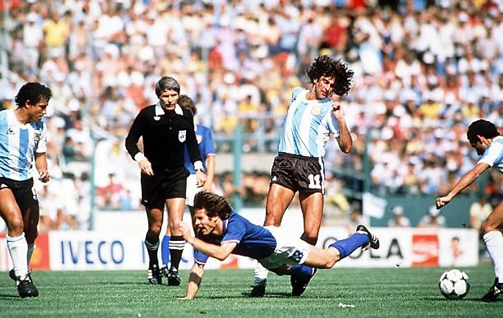 Марио Кемпес срезает Габриэля Ориали, которому, пожалуй, в рядах итальянцев наиболее досталось
