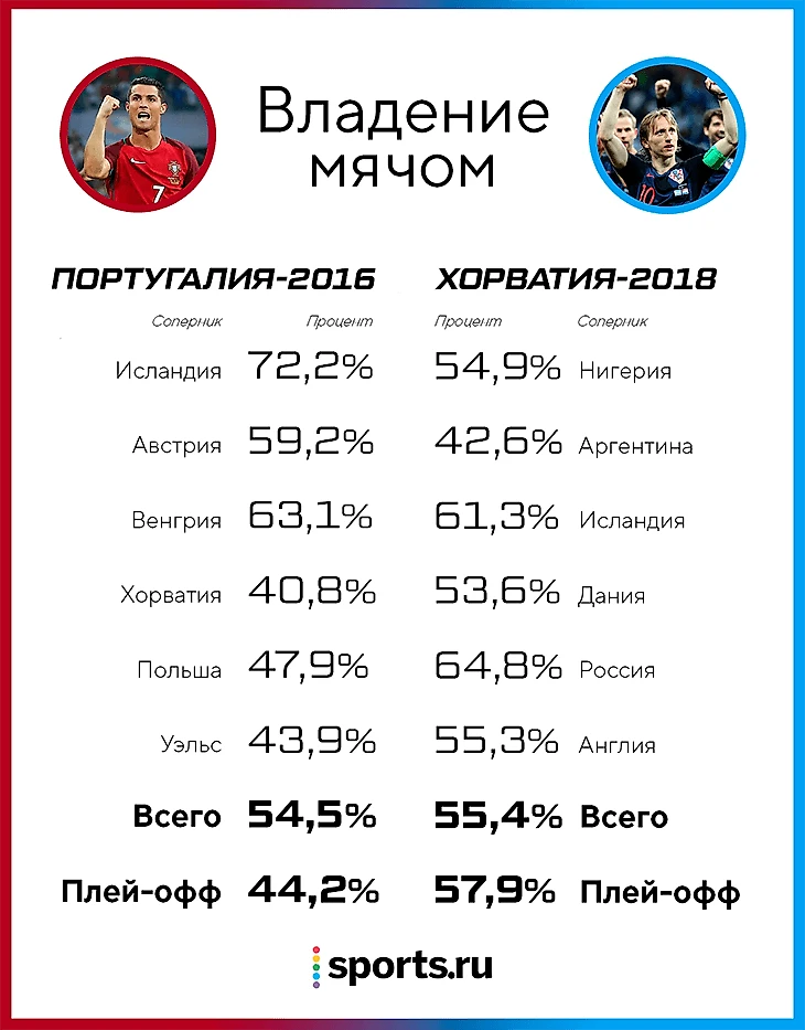 В финале Евро Франция играла против португальцев, которые в плей-офф того турнира неожиданно перешли на контратаки и отдавали мяч абсолютно всем соперникам. Португалия-2016 не сильно уступает Хорватии-2018 во владении, но только если рассматривать оба турнира в целом – в плей-офф между двумя соперниками французов – пропасть.
