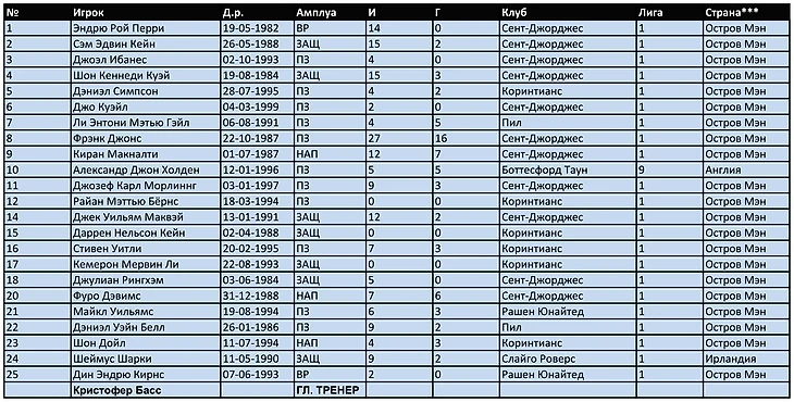 За пределами родины выступает ещё один игрок, полузащитник Александр Джон Холден, представляющий "Боттесфорд Таун" из 9 английского дивизиона. Остальные игроки – из четырёх клубов мэнского чемпионата. Руководит командой местный специалист Кристофер Басс. Последние 17 лет он также тренирует клуб мэнской высшей лиги "Сент-Джорджес", и под его руководством "святые" выиграли 12 чемпионских титулов.