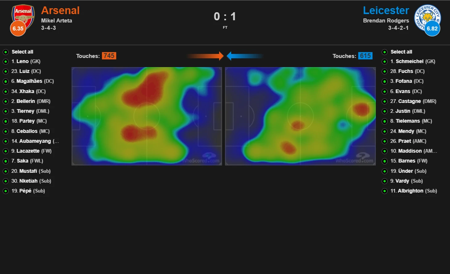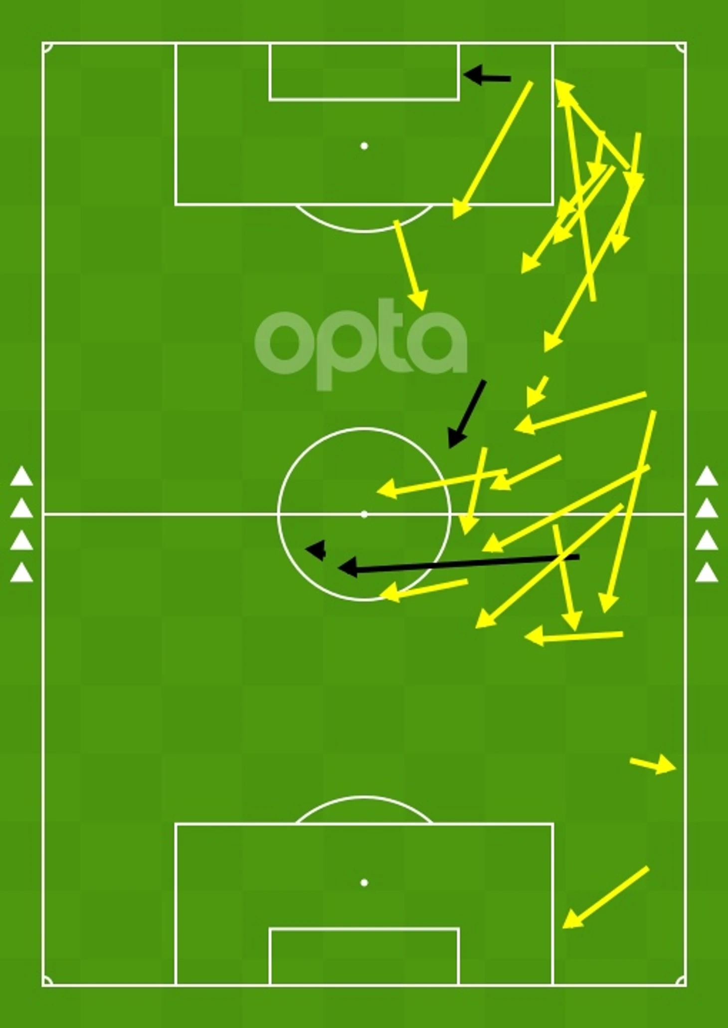 Вот тепловая карта игроков в матче «Арсенала» – «Лестер», на которой виден явный перевес в сторону левого фланга. Но что важнее, так это то, что «Арсенал» почти не задействовал финальную треть поля. По подсчетам «The Athletic», У «Арсенала» только 35% владения мячом происходит в атакующей трети поля, это 14-й показатель во всей лиге. У «Манчестер Сити» 50%, далее идут «Ливерпуль» (48%) и «Манчестер Юнайтед» (43%). В среднем за матч «Арсенал» проводит 29 комбинаций в атакующей трети поля, хуже только у «Ньюкасла».