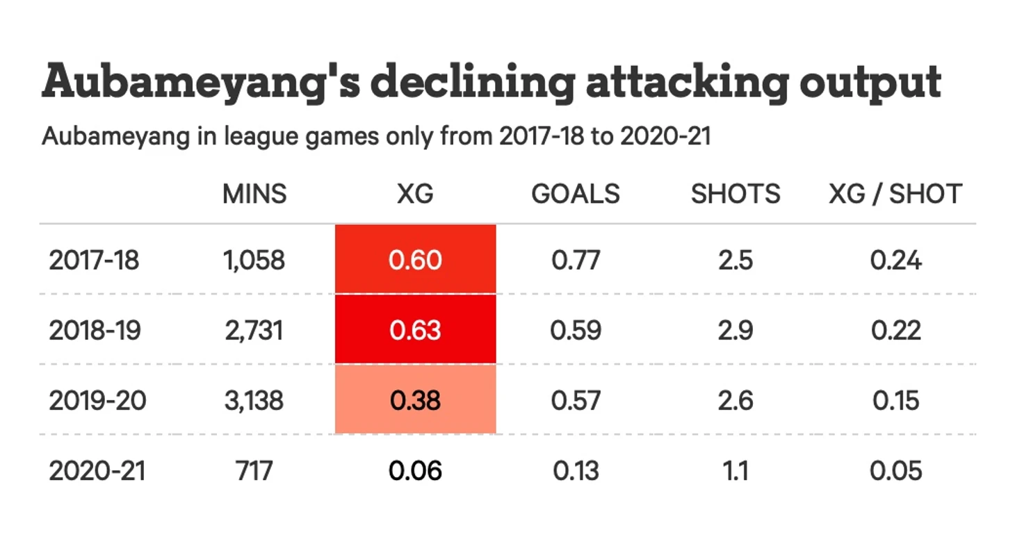 Можно ли винить игроков атаки «Арсенала» в том, что они не забивают и не создают остроту? Спорный вопрос, так как проблема скорее не в их плохой реализации, а в игре команды в целом. «Арсенал» наносит в среднем всего девять ударов за матч по воротам соперника, это 15-ый показатель в АПЛ. Это проблема Микеля Артеты и, кажется, пока он не знает, как ее решить. Однако по качеству моментов «канониры» занимают 9-ую позицию, имея в среднем 1,1 xG за игру. Один нанесённый удар «Арсенала» оценивается в 0,12 xG – третье место. Источник: "The Athletic". Но, несмотря на это, у атакующих игроков «Арсенала» действительно виден спад в игре.