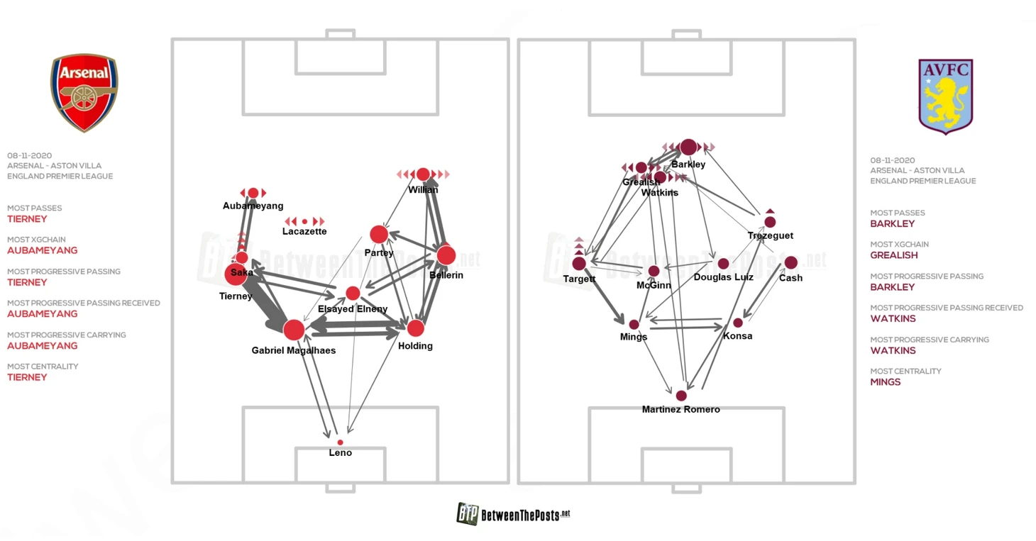 «Арсенал» хорошо выходит из под высокого прессинга, но дальше – ничего. Лишь перекаты мяча в полузащите и незнание того, что вообще делать с мячом. Вот, например, карта передач игроков в матче «Арсенал» - «Астон Вилла».