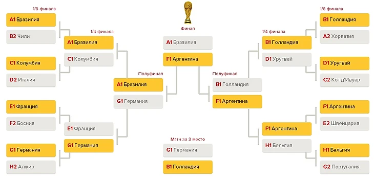 Все, кто вышел со вторых мест, сразу же выбыли из турнира. И далее все пары 1/4 и 1/2 финала были спрогнозированы мною практически на 100%, за исключением одной команды: у меня значится Урвугвай вместо Коста-Рики. Но об этом я уже пояснил, что трудно было ожидать от костариканцев первого места в группе смерти.