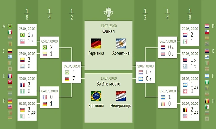 На чемпионате мира в Бразилии было четыре явных фаворита: Германия, Аргентина, Бразилия и Голландия. Именно эти сборные и вошли в итоге в квартет сильнейших. За весь турнир случилась лишь одна неожиданность, когда Коста-Рика умудрилась занять первое место в группе смерти, опередив Уругвай, Италию и Англию. Именно эта сенсация и подбила тогда мой экспресс с коэффициентом более 100, а все остальные фавориты своих групп уверенно заняли первые места.