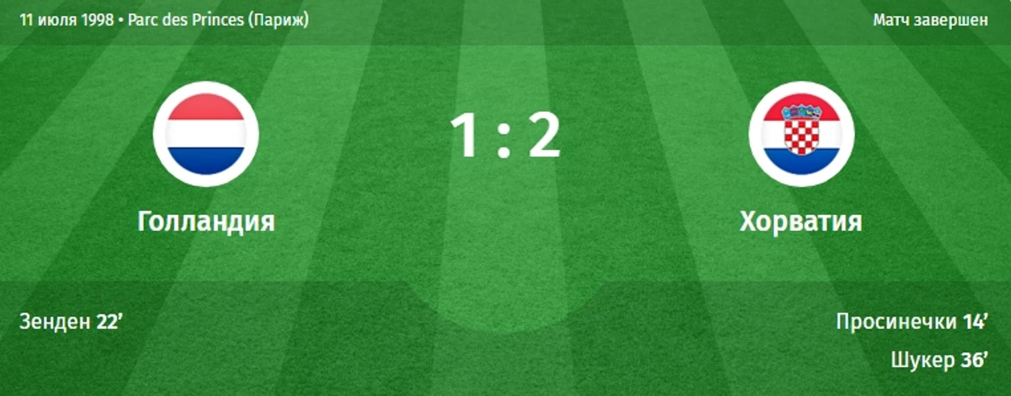Затем хорваты уступили в полуфинале будущим чемпионам мира - французам. Но в матче за бронзовые медали переиграли звездную сборную Голландии под руководством знаменитого Гуса Хиддинка. В те времена за "оранжевых" выступали такие легендарные игроки, как Ван дер Сар, Франк де Бур, Зеедорф, Давидс, Овермарс, Коку, Клюйверт и Деннис Беркамп.