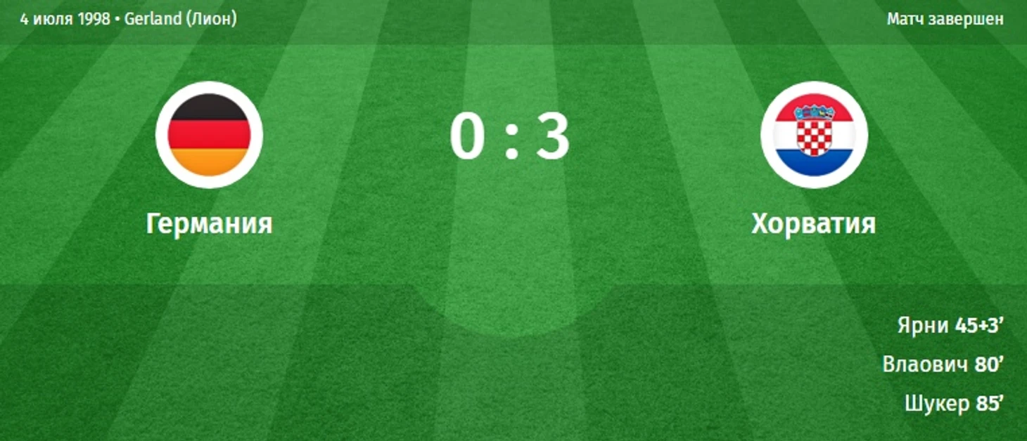 Спустя два года на чемпионате мира во Франции хорваты отомстили своим обидчикам и разгромили действующих чемпионов Европы со счетом 3:0 в 1/4 финала.