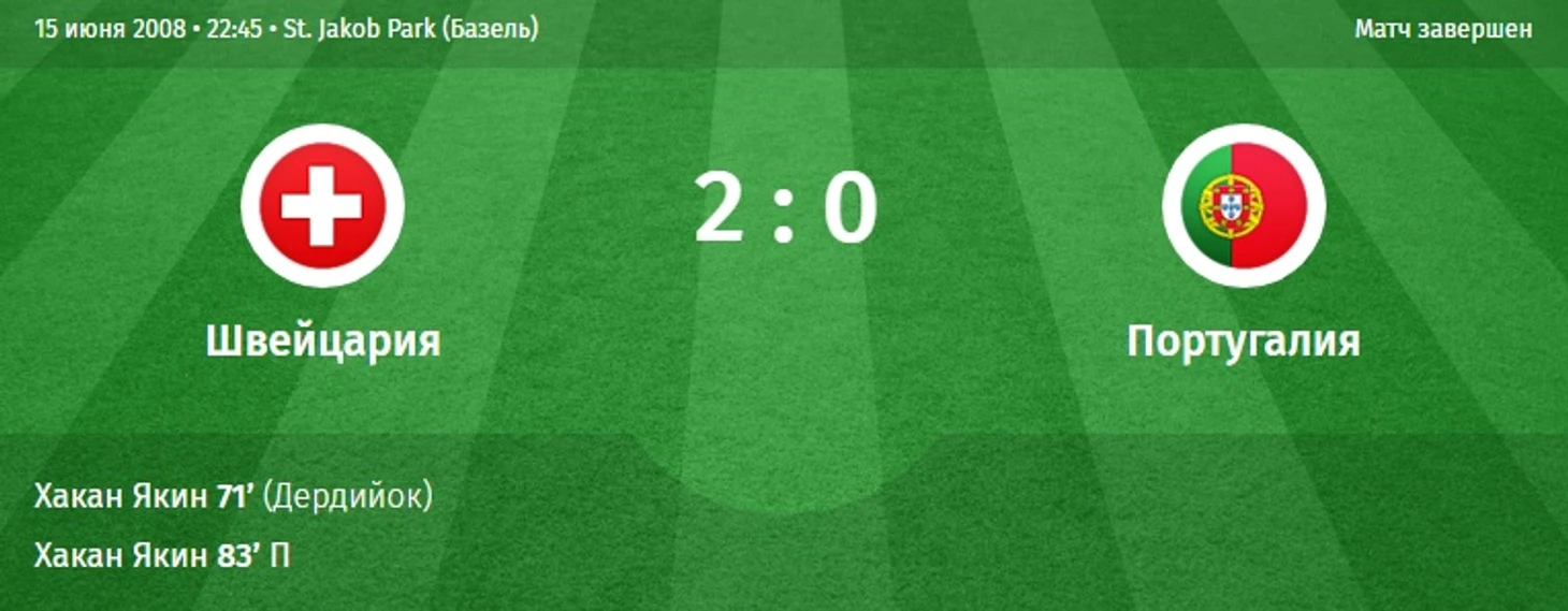 На домашнем чемпионате Европы Швейцария не вышла из группы, но при этом она обыграла Португалию во главе с победителем Лиги чемпионов в составе "МЮ" и будущим обладателем "ЗМ" Крништиану Роналду.