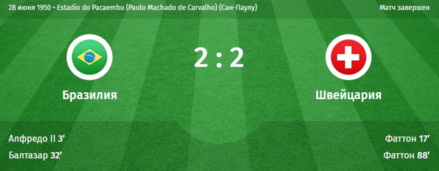 Кстати, это был второй поединок между Бразилией и Швейцарией за всю историю. Первая встреча между этими сборными состоялась на ЧМ-1950 и тогда швейцарцы тоже не уступили кудесникам мяча, которые стали на том турнире вице-чемпионами мира.