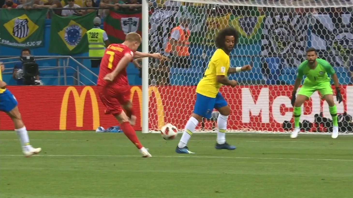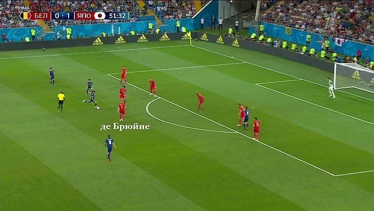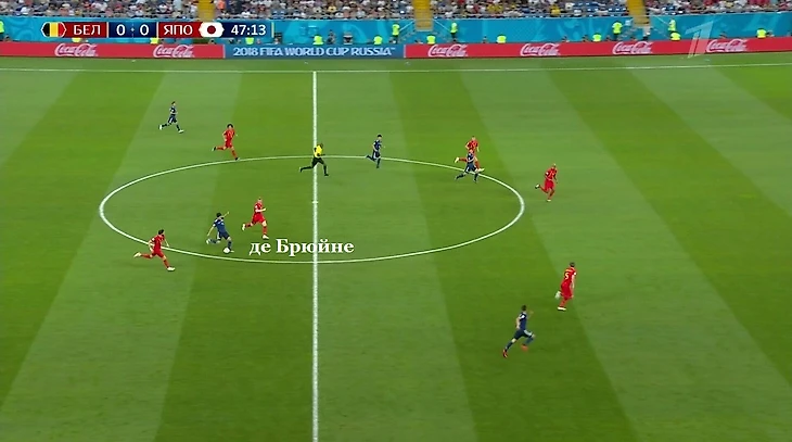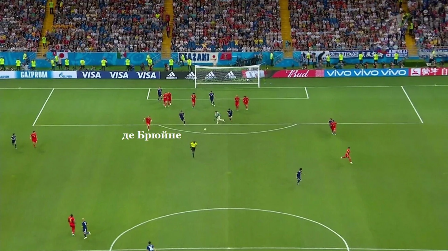 Перед первым голом в ворота бельгийцев видно как Кевин бежит в центре поля рядом с соперником, владеющим мячом, и не навязывает ему никакой борьбы. В итоге последовала голевая передача и японцы открыли счет.