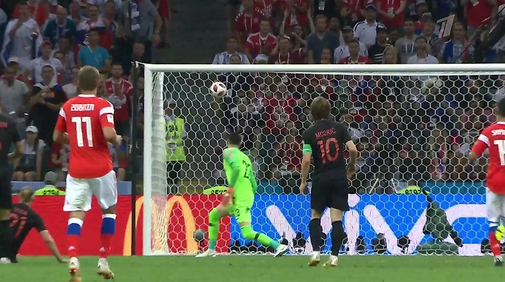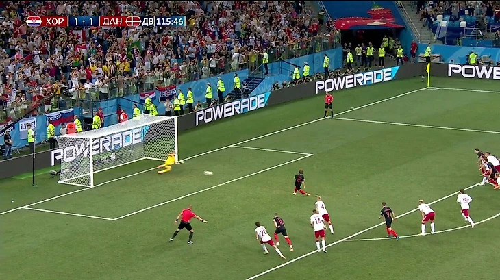 За пять минут до конца дополнительного времени Лука Модрич мог поставить точку в матче с датчанами и избавить свою команду от выматывающей серии послематчевых пенальти. Однако, штатный пенальтист хорватов сплоховал и не смог реализовать одиннадцатиметровый удар.
