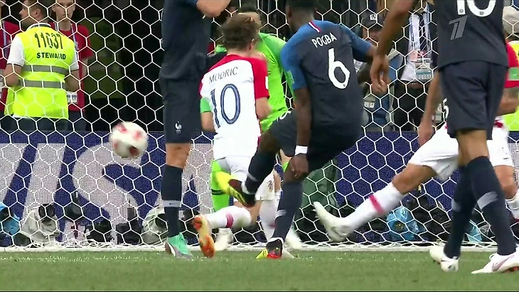 Обратите внимание на его позицию в момент удара Поля Погба. И вместо того, чтобы вступить в отбор и хотя бы попытаться заблокировать удар француза, Модрич просто отворачивается от мяча.