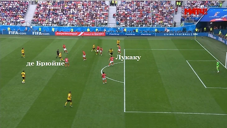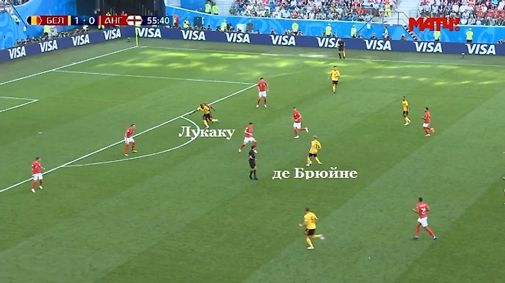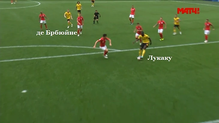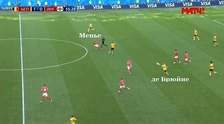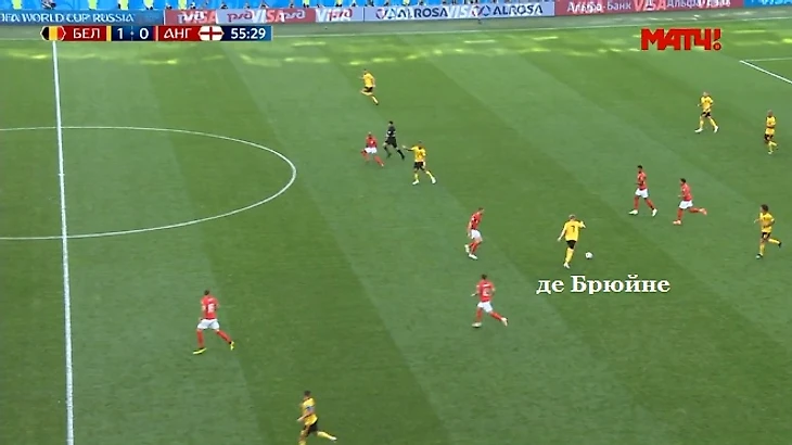 Де Брюйне начинает атаку бельгийцев со своей половины поля и с помощью шикарной диагональной передачи бросает в прорыв по правому флангу Томаса Менье.