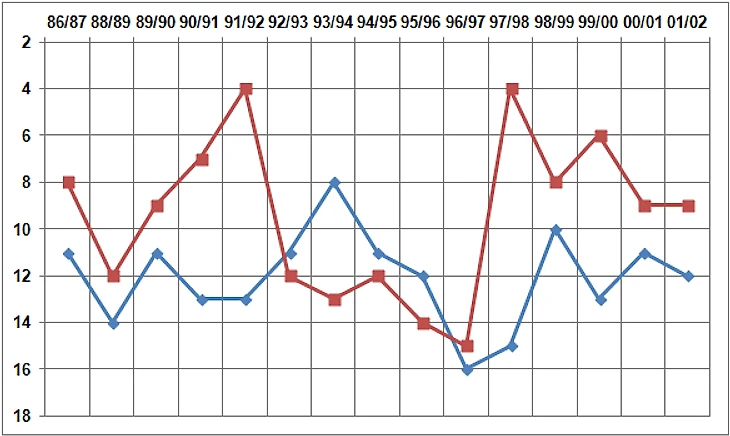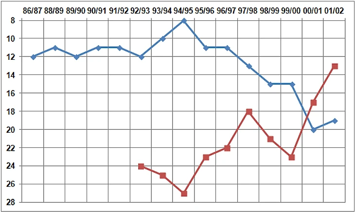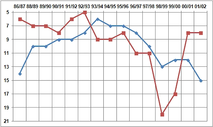 Рисунок 2. Результаты выступления на чемпионатах мира сборных Швейцарии (красная линия) и Австрии (синяя линия).