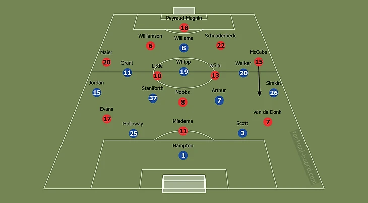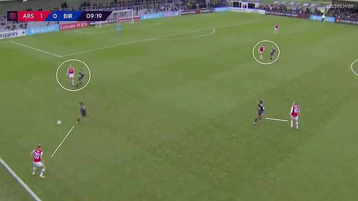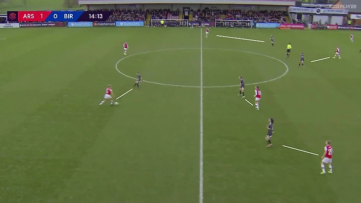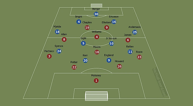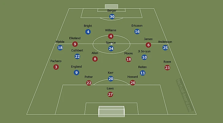 У гостей было одно изменение. На правом фланге обороны вышла Рэйчел Роу. В прошлом матче на этой позиции играла Кристин Лейне, центральный защитник. Роу – более смелый вариант, потому что она активнее выдвигается вперёд, для конкретного матча это было важно.