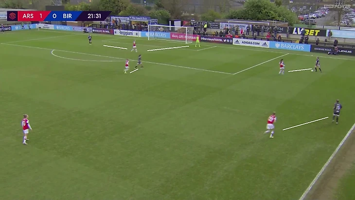 Первый удар по воротам от "Арсенала" привёл к первому голу. Так как не получалось вскрыть соперника с игры, приходилось по-максимуму использовать стандарты. После розыгрыша углового мяч в ворота отправила Ким Литтл. Отличная голевая передача на счету Вивианн Мидемы: