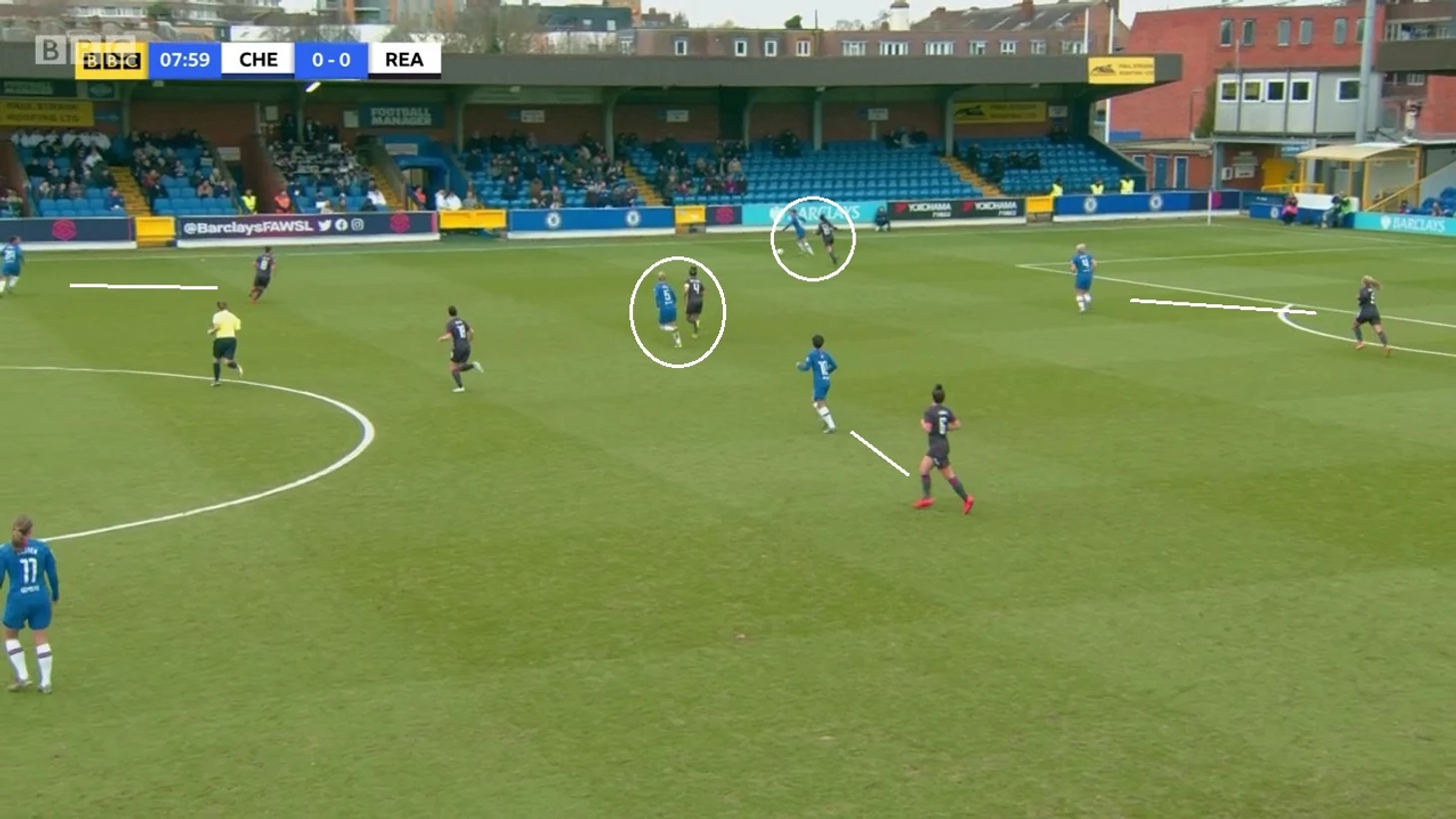 "Рединг" пропустил первый гол после неудачной попытки прессинговать в меньшинстве. "Челси" ожидаемо прошёл давление. Сэм Керр отметилась первым результативным действием, отдав передачу на Бэт Инглэнд: