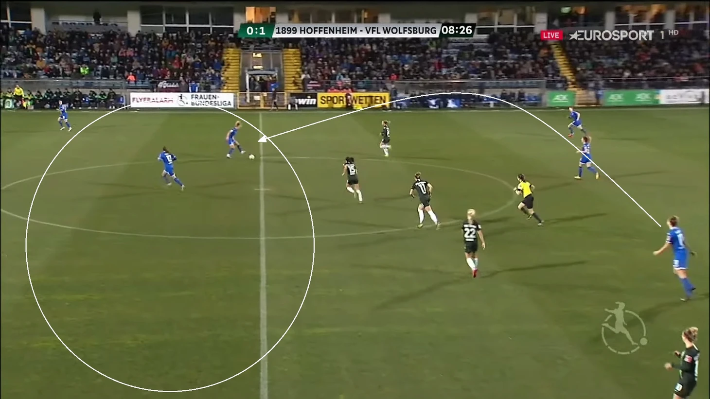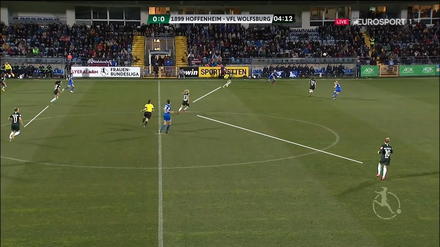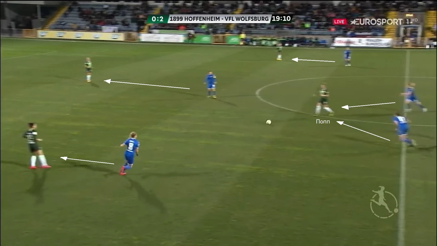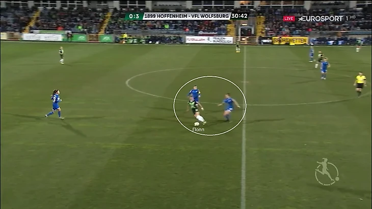 Затея себя скорее не оправдала, потому что после передачи из линии обороны Попп сразу накрывали двое игроков "Хоффенхайма". В таких ситуациях Александра обычно отдавала пас назад, то есть с продвижением мяча через центр возникали проблемы.
