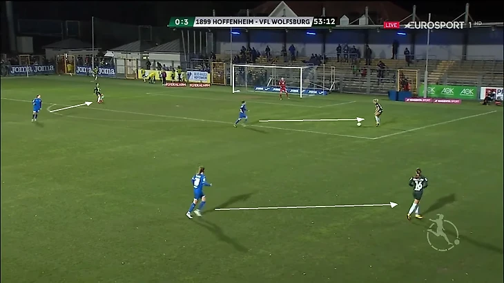 В позиционной обороне "Вольфсбург" располагался по схеме 4-2-3-1, единственной выдвинутой нападающей была Ева Пайор, а Пернилле Хардер действовала в оттяжке: