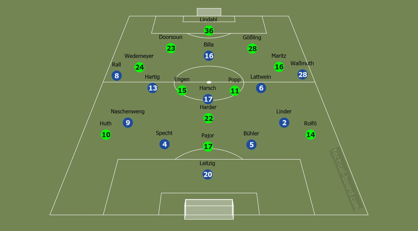 Наставник "Вольфсбурга" Штефан Лерх выпустил в стартовом составе сразу пять ярко выраженных атакующих игроков, однако, одного из них использовал в нетипичной роли, Александра Попп появилась в опорной зоне. В составе "Хоффенхайма" отсутствовала капитан Леони Панкрац, а на левый фланг обороны впервые в старте вышла Катарина Нашенвенг.