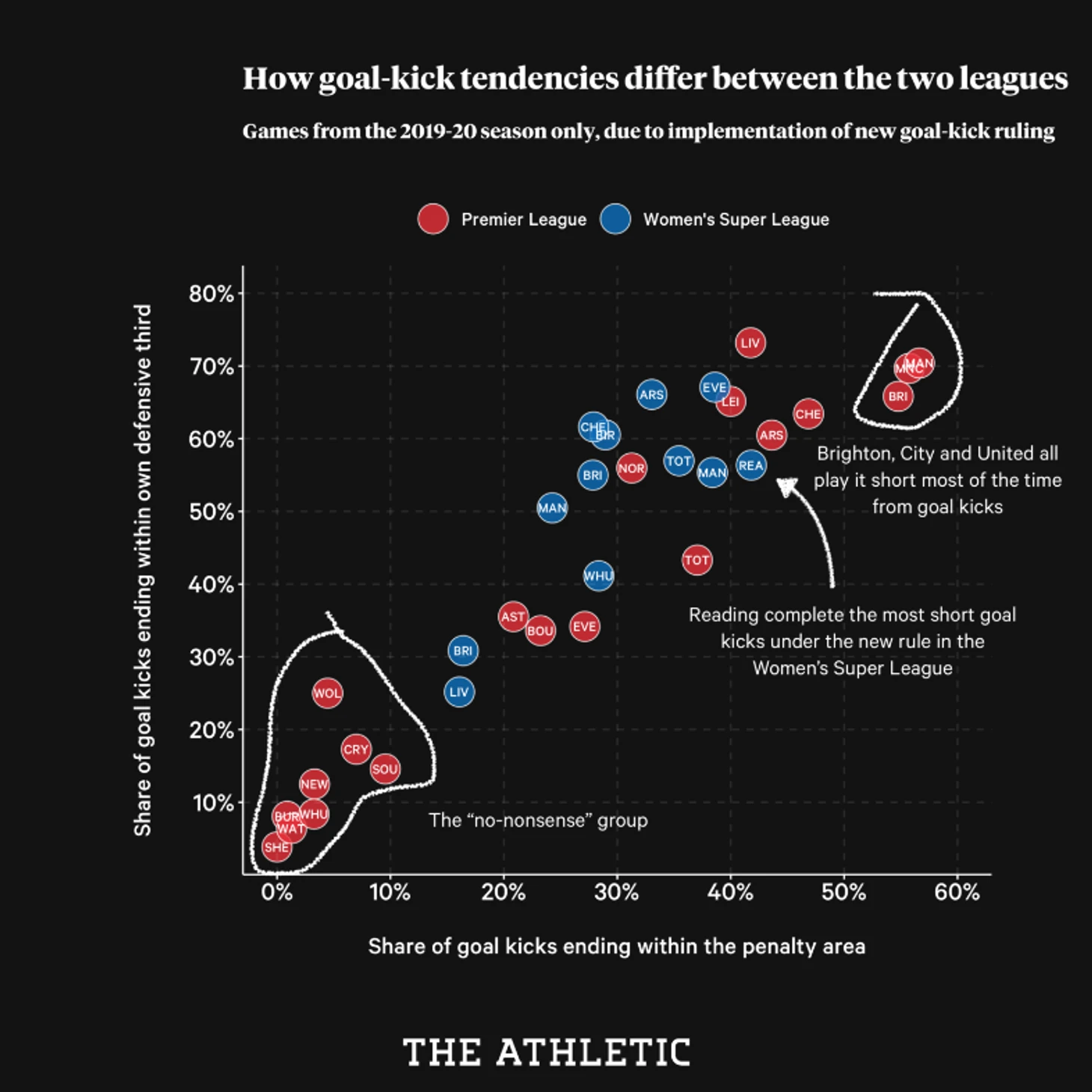 Если мы копнём глубже и посмотрим розыгрыши от ворот не только в пределах штрафной, но и в пределах своей трети поля, то увидим, что большинство команд Суперлиги предпочитает не выносить мяч, а строить атаку последовательно. Если сравнить эти данные с цифрами команд АПЛ, то женская лига выглядит даже предпочтительнее.