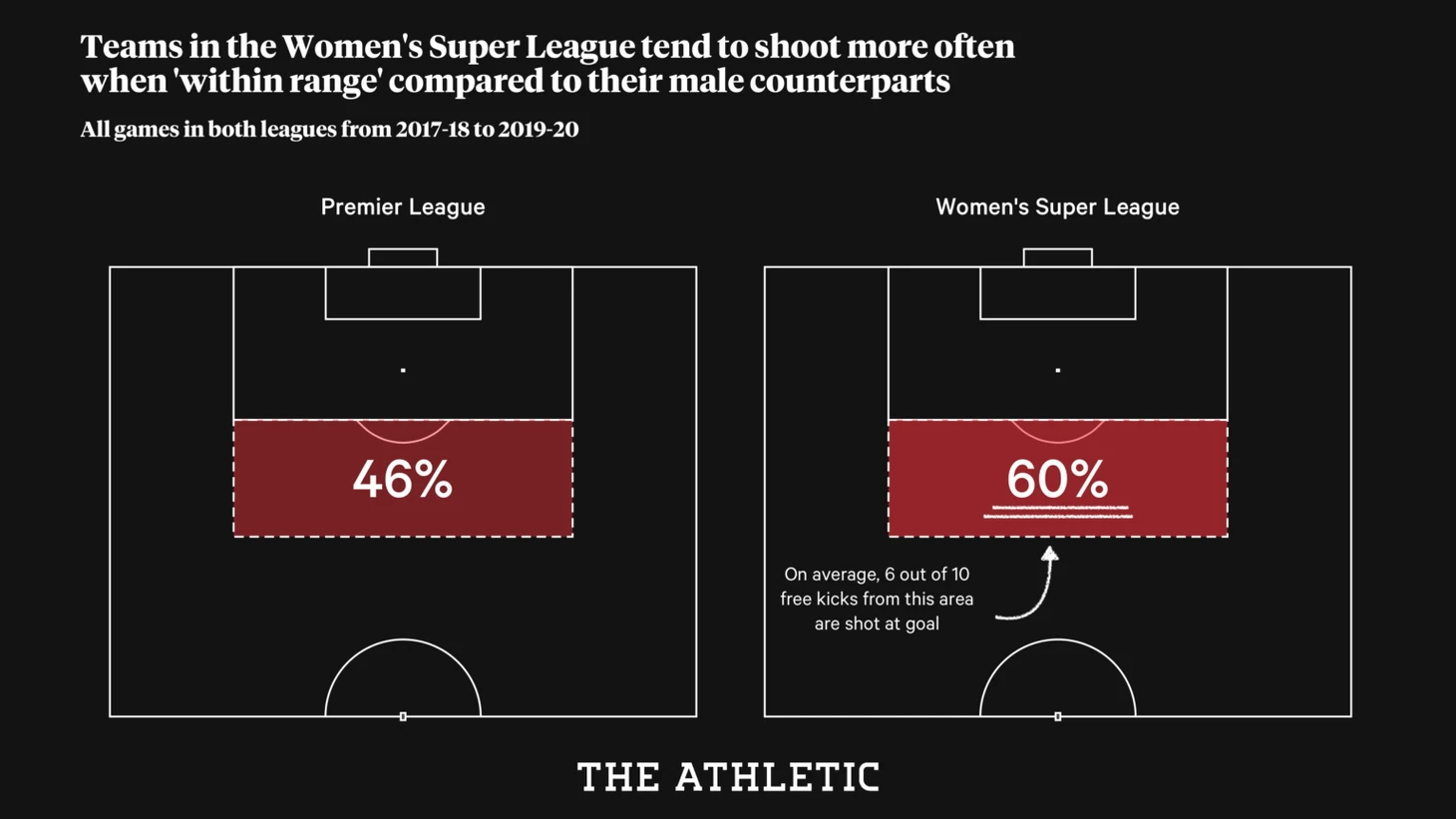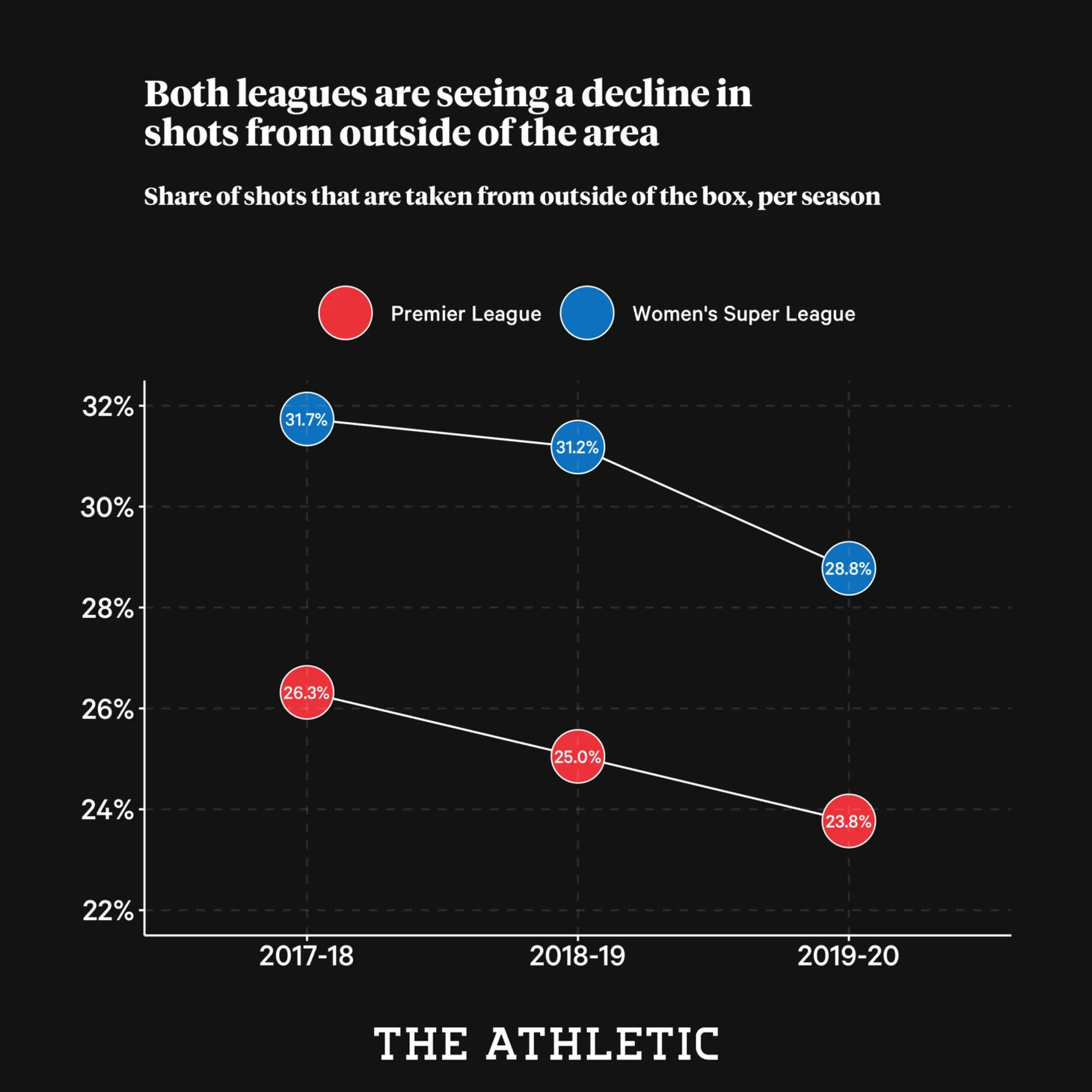 Из-за возросшей роли статистического анализа в футболе большинство тренеров пришло к выводу, что лупить по воротам издалека – это неэффективное использование владения. Это распространилось и на женский футбол, хотя, как видно из графика, девушки по-прежнему чаще бьют из-за пределов штрафной.