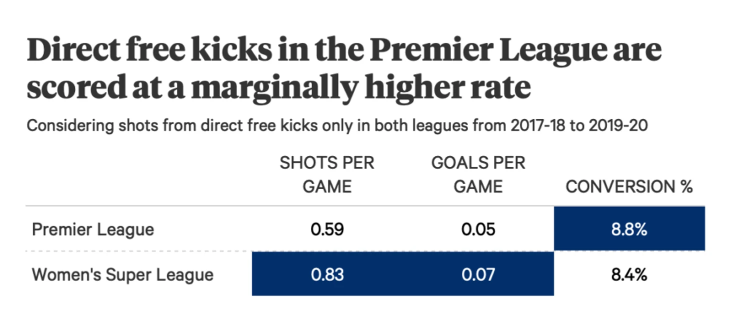 Ниже приведена сравнительная таблица прямых ударов со штрафного в среднем за игру в АПЛ и Суперлиге. Если смотреть на абсолютные цифры, то девушки забивают больше, но реализация таких моментов в мужском чемпионате чуть выше.