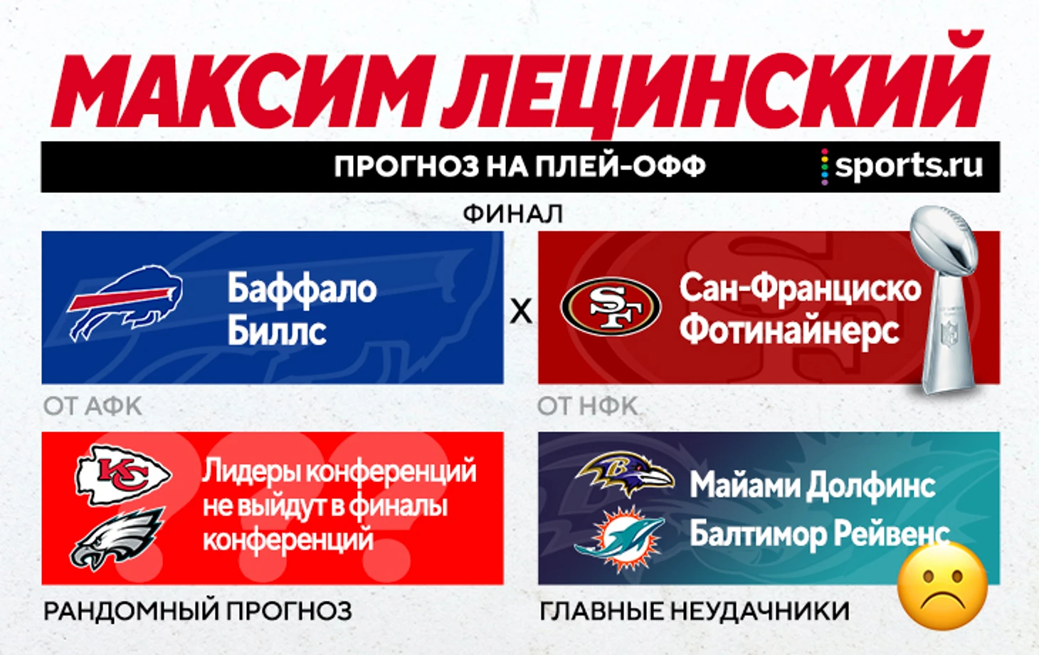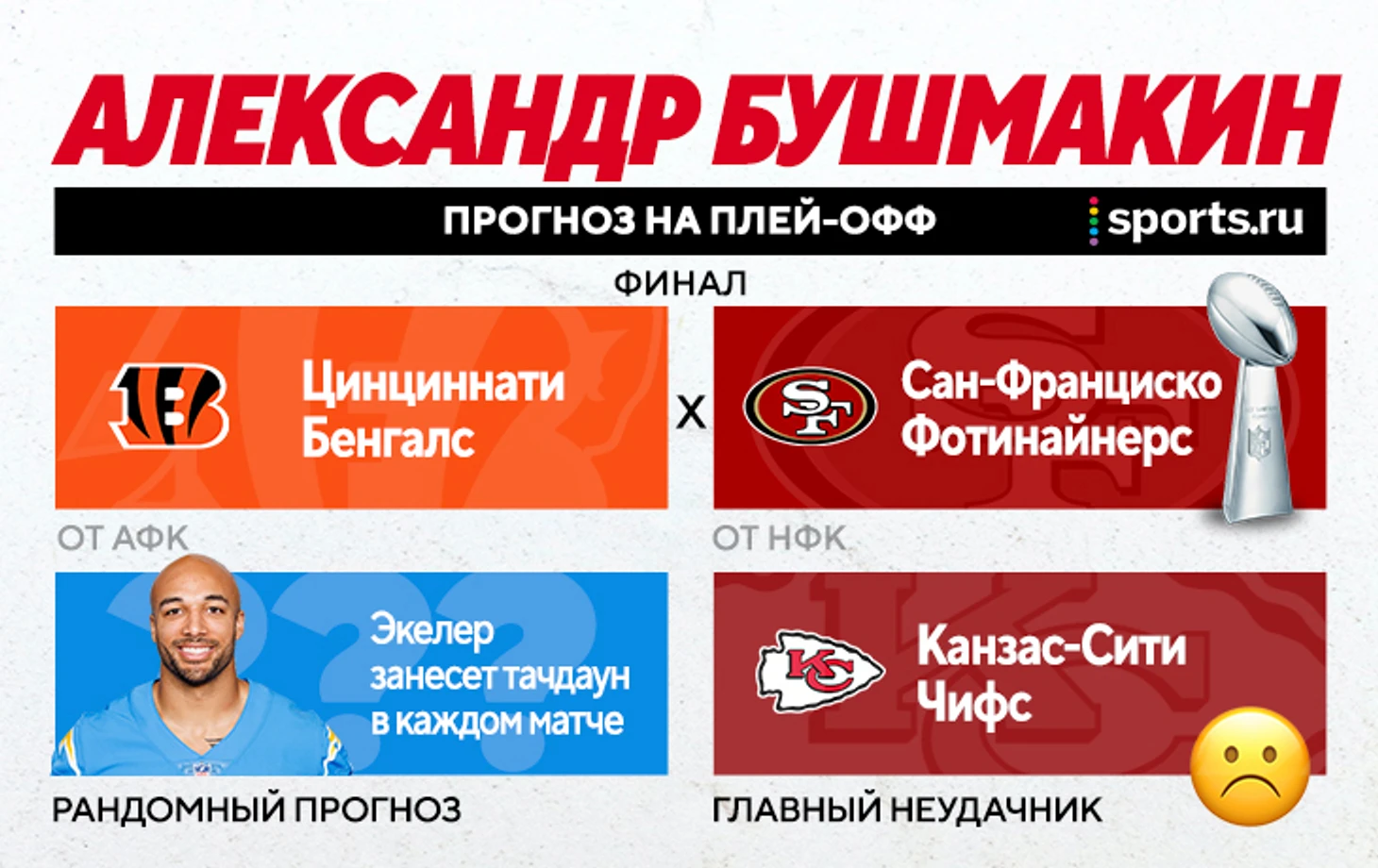 Супербоул. Если говорить про НФК, то было бы красиво, доберись до Супебоула «Сан-Франциско» с Броком Парди. Новичок «Мистер Ненужный» в главной игре года? Фантастика! Тем более, «Найнерс» за один регулярный сезон сменили трех стартовых квотербеков. Учитывая то, как команда разогналась под плей-офф, шансы на такой исход весьма высокие. Я в это верю.