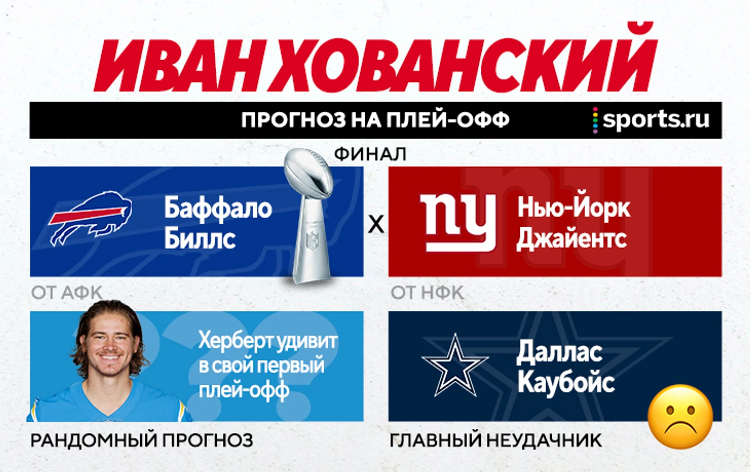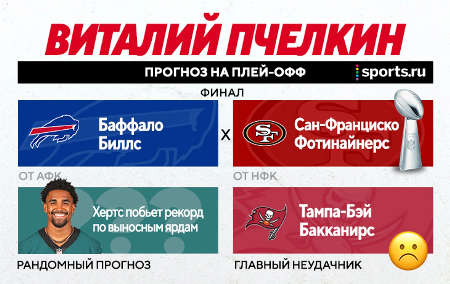 Но все же я прогнозирую победу «Баффало». Это будет легендарный пост-сезон для Джоша Аллена, прошлый плей-офф которого закончился в абсолютном хертбрейке, с голливудским концом. Учитывая, сколько проблем прошли «Биллс» – от снежных бурь, из-за которых приходилось переносить игры из Баффало, до трагедии с Дамаром Хэмлином – эта команда сильна духом и Ломбарди в восточном Нью-Йорке будет идеальным завершением сезона.