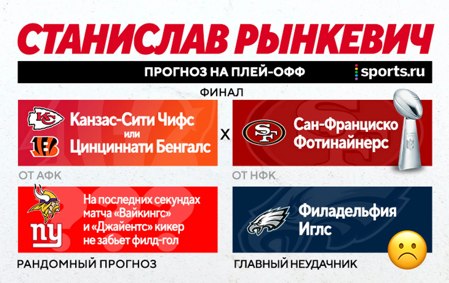 Рандомный прогноз. В финалах конференций не сыграют команды, выигравшие эти конференции. «Чифс» все таки не смогут в третий раз за сезон на тоненького обыграть Джастина Херберта, а «Иглс» снова оступятся о Тома Брэди.