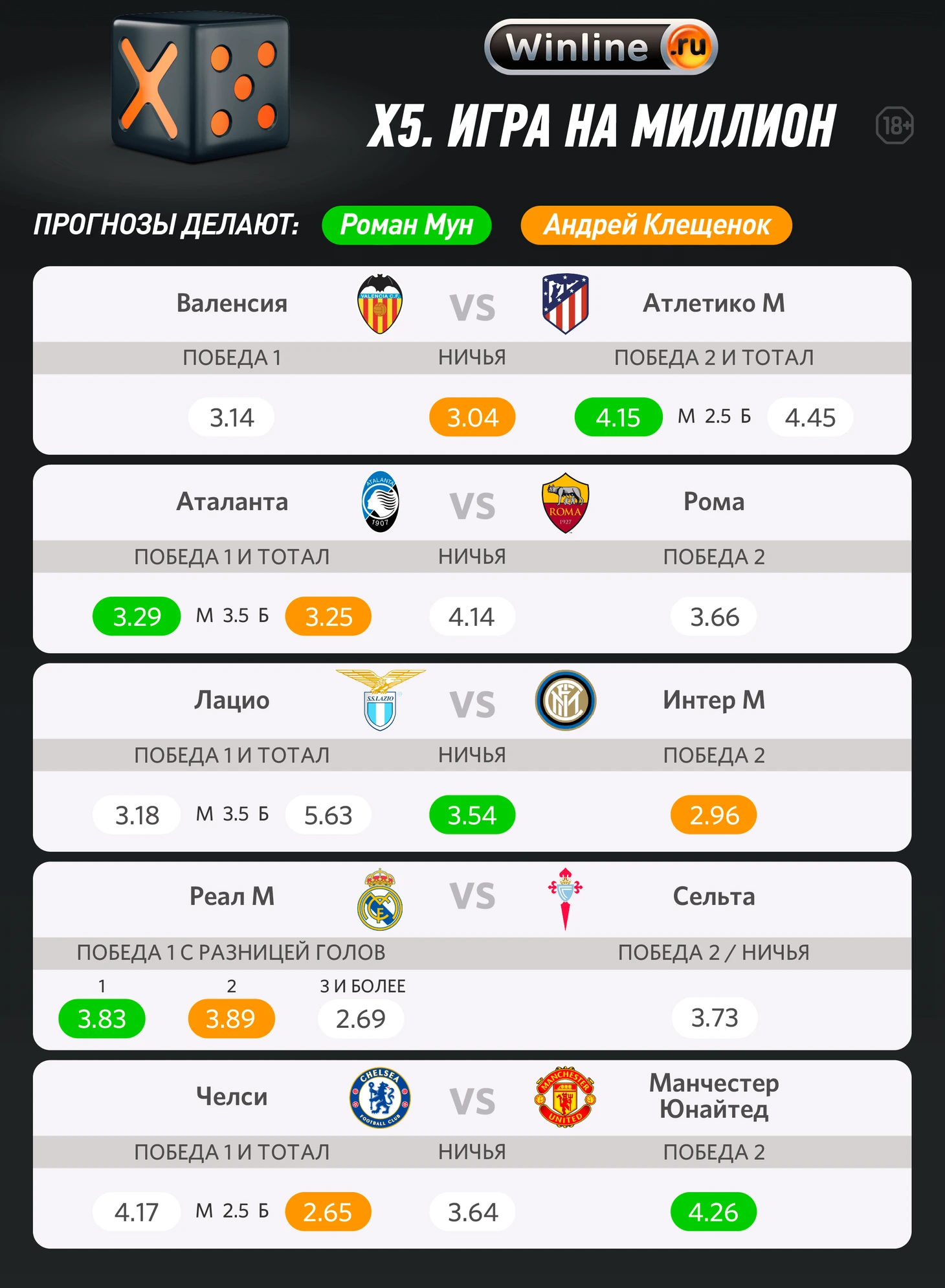 Вы в блоге «X5 – игра на миллион», который мы ведем вместе с букмекерской компанией Winline. Еженедельно мы делаем пять прогнозов на европейские топ-матчи. Вы тоже можете их сделать (бесплатно!) в приложении Winline – и если отгадаете все пять, получите миллион рублей.