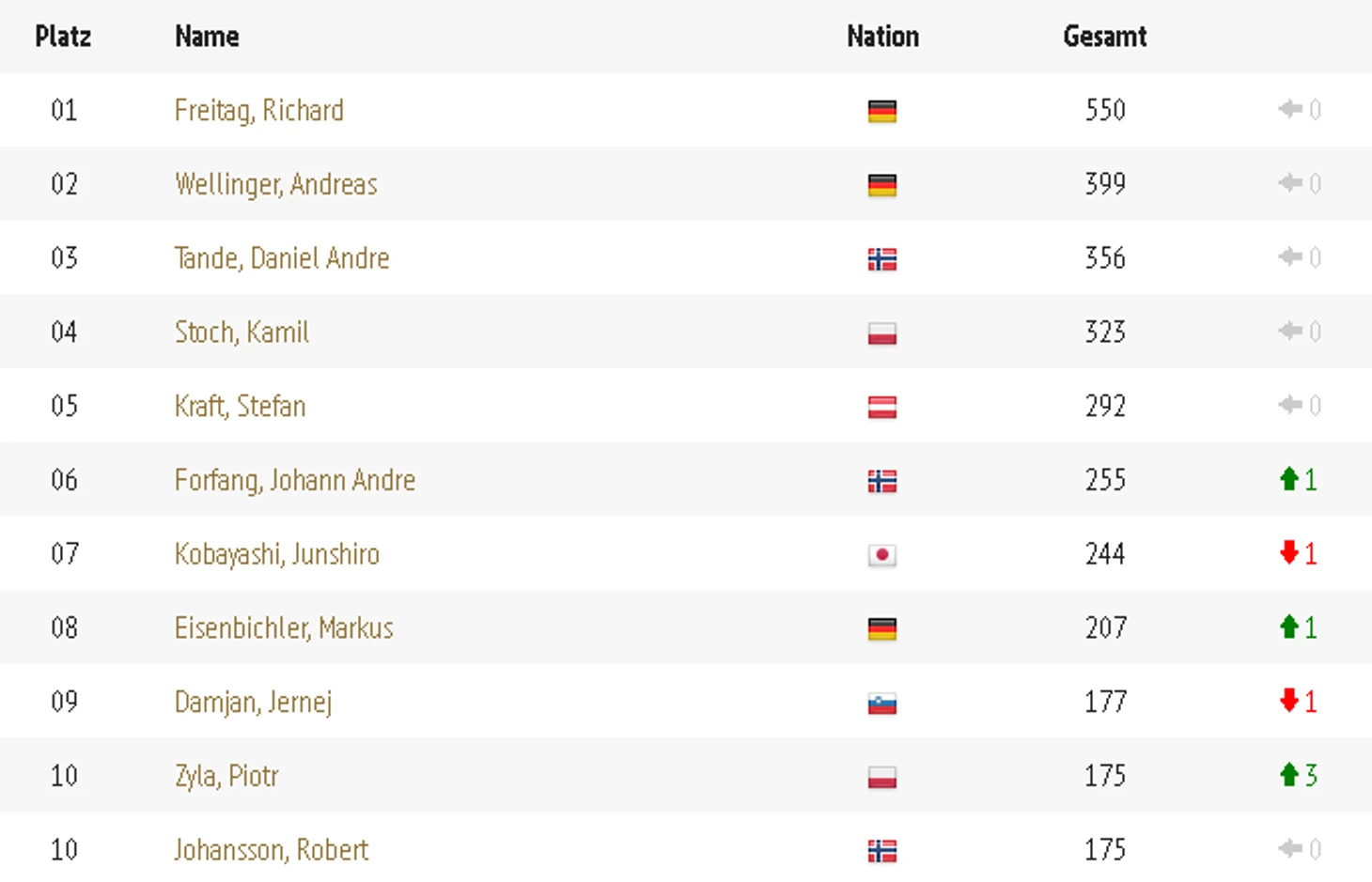 Прыжковая пятница продолжается: в общем зачёте Кубка мира по-прежнему лидирует Рихард Фрайтаг, одержавший третью победу в сезоне перед Турне – впервые среди немецких спортсменов спустя 17 лет после Мартина Шмитта.