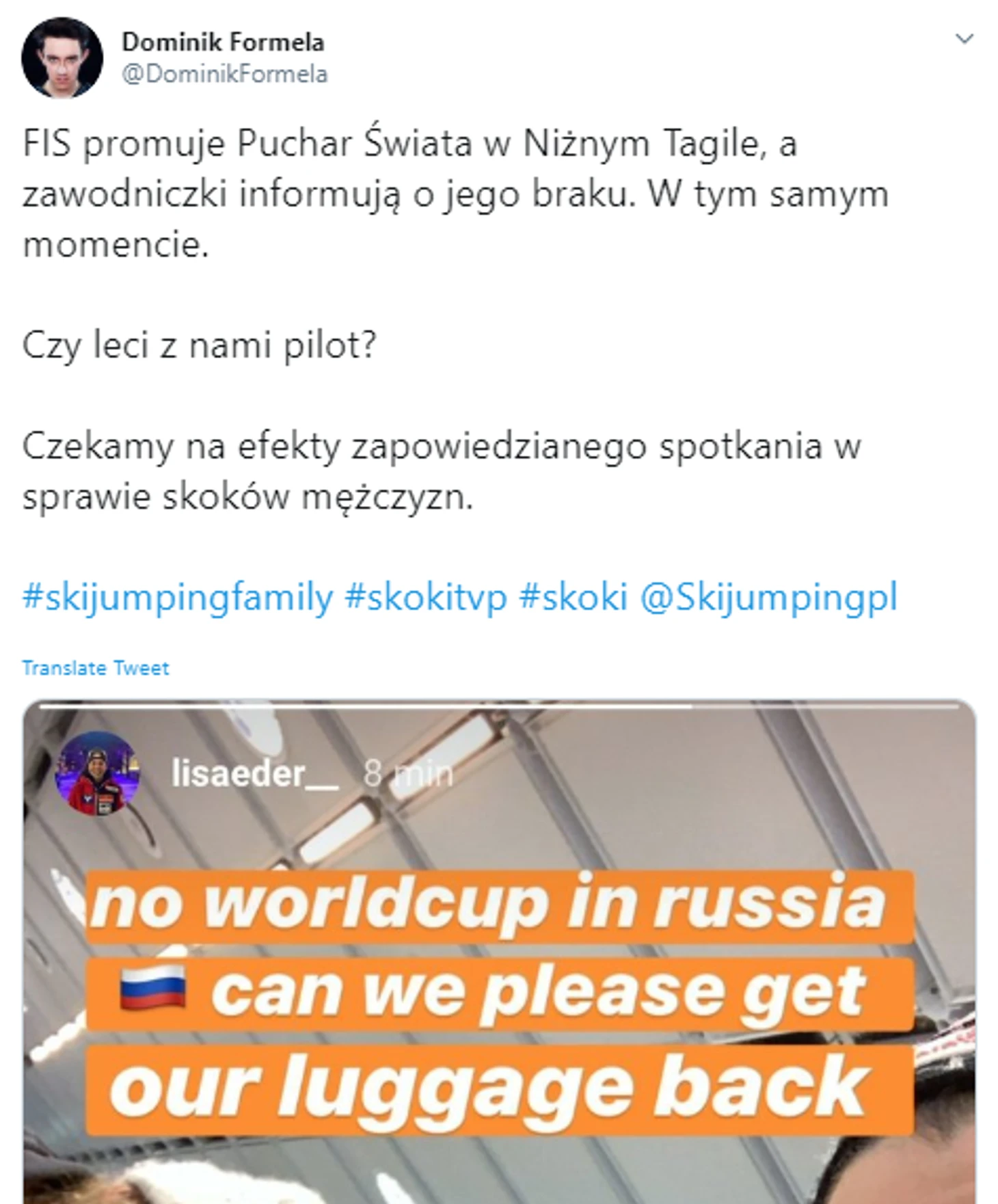 Корреспондент Skijumping.pl Доминик Формела: «ФИС продвигает Кубок мира в Нижнем Тагиле, а спортсменки в то же время сообщают об отмене. А пилот-то с нами полетит вообще? Ждём информации и о мужских соревнованиях».