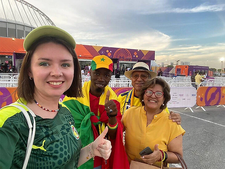 Она сходила до тикет-офиса, где ей помогли, а на обратном пути неожиданно познакомилась с сенегальцем и парой из Эквадора. Помогли футболка Сенегала и испанский язык, которым Марина владеет. Закончилось совместным фото.