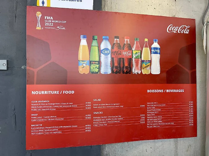 Как вы поняли, мы оказались на стадионе сильно заранее, поэтому размеренно изучили весь кулинарный ассортимент. После Катара у нас статус футбольных дегустаторов. Обещаем, что попробуем и дадим оценку блюдам на следующих матчах, в этот день не хотелось есть совсем. Тем не менее, цены мы вам покажем. Умножайте все на семь (или спрашивайте в комментах, если что-то не разглядели):