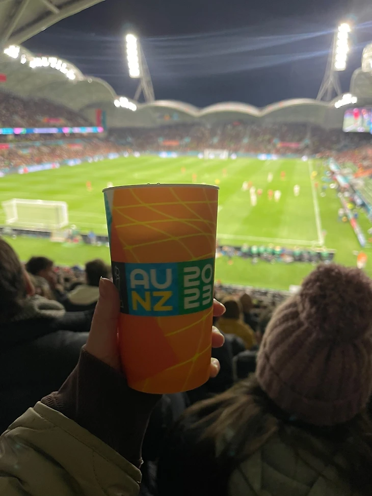 С другой – появились официальные стаканы с символикой ЧМ. Обычно на больших турнирах стаканы выдаются сразу с напитком, но здесь контрактов с брендами нет, поэтому и стаканы продаются отдельно. Цена – 15 австралийских долларов.