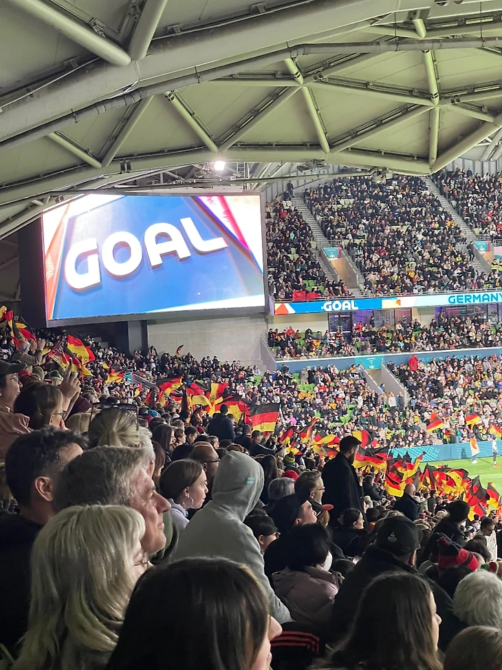 Сразу бросалась в глаза немецкая группа поддержки за воротами – с огромным количеством флагов.